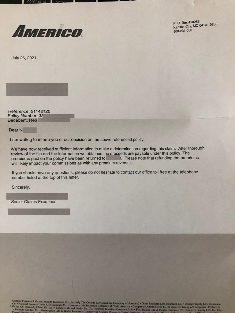 We waited for 3 months to get a final decision from Americo life insurance company. The company came back with a decision. They decided that they could only give 338.43 (that is the total of all the premiums she had paid for the policy). Again, she only got a check of 338.43. She did not get the 20,000.