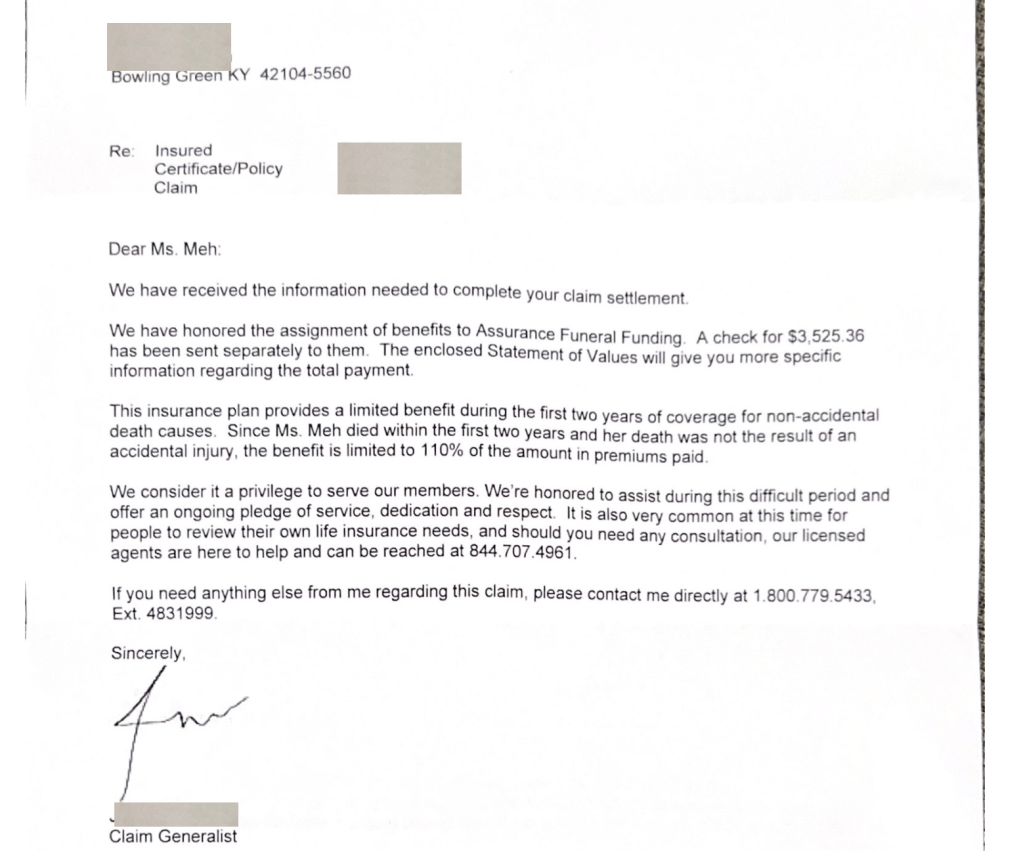 Lu Meh passed away in Kentucky state…. in July 2023. She had her life insurance policy for about one year but it was not 2 years old yet. Due to the contestability clause (and the graded policy she had), the family only got back all the premiums they had paid into the policy, plus + some, that’s all.