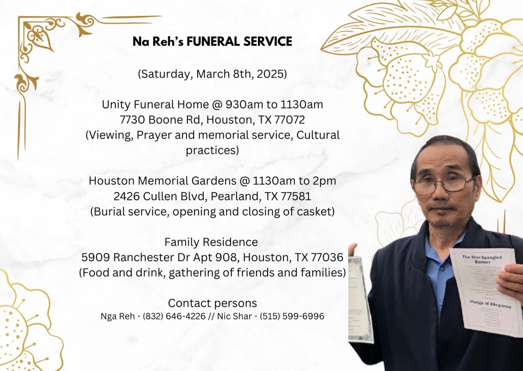 Na Reh had passed away in February 2025. We will update the details later on… He had a small life insurance policy with Mingala Insurance as well.